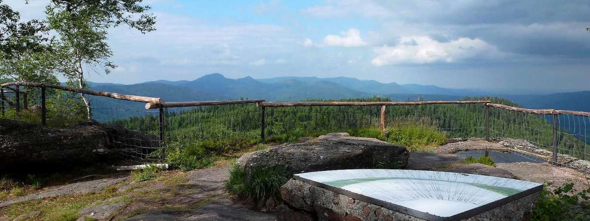 Vom auf 889 m gelegene Felsen "La chatte pendue" haben Sie einen umfassenden Ausblick auf drei Gipfel im Bruche Tal : den Donon, die Hochebene des Champ du Feu und den trapetzähnlichen Climont. Diese eigenartige Bezeichnung ist seit je her Anlass zu all möglichen Spekulationen. Zum Beispiel, glaubt man der mundartlichen Bezeichnung "Pirrz hhatte pendaïe", so ist hier eher die Rede von einem "hängenden Felsen".